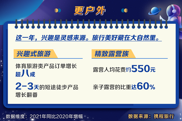 还有一种远离都市喧嚣,家门口亲近大自然的旅游方式在今年出圈。携程数据显示,今年露营在携程站内搜索量同比增长8倍,露营人均花费约550元。精致露营也成为80、90后的爱,在携程报名露营产品的游客中,80、90后各占40%;同时,露营也是就近遛娃的好去处,携程平台上亲子露营的比重高达60%。