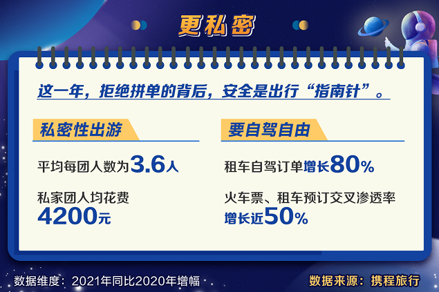对于出游安全的考量也是疫情之后萌发出的最核心诉求之一。消费者逐渐摒弃以往大团、长线、走马观花的旅游方式。私家团就是在这一趋势下,成为家庭出游最受消费者欢迎的旅游方式,从团队游规模占比不到3%上升到1/3。今年携程平台上,报名私家团的订单量同比增长近70%。呼伦贝尔、三亚、西宁、贵阳、丽江、桂林、张家界、西双版纳、九寨沟、乌鲁木齐成为最受消费者欢迎的十大私家团目的地。今年国内私家团人均花费为4200元左右。平均每团人数为3.6人,基本相当于一个三口或四口之家。
