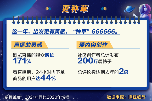 携程数据显示,2021年浏览过携程直播的观众人数同比增长171%;44%的用户观看直播后在24小时内下单直播间商品;近70%的用户观看直播后会在30天内下单携程全站商品。