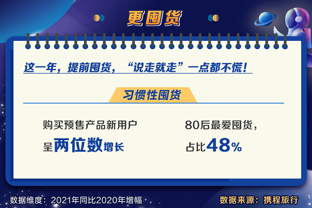 自疫情爆发以来,优质的性价比、宽松的有效期、退费自由是促成用户养成“囤货”消费习惯的重要动力。2021年购买携程预售产品的新用户同比实现两位数增长,最爱囤货的用户是80后,占比48%,其次是90后,占比25%。以上海、三亚、杭州、珠海、成都为目的地的商品最受“囤货族”的青睐。