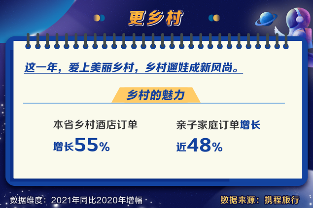 此外,2021年去乡村遛娃成为亲子家庭的一种新风尚,今年乡村游的订单中,亲子家庭订单同比增长近30%。