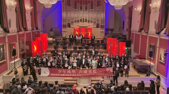 音乐会以《罗莎蒙德序曲》《哈利・波特与火焰杯》配乐的合奏演绎拉开帷幕,两国乐手同台献艺、技法娴熟,瞬间点燃现场热烈氛围。随后,北京少年金帆管弦乐团的小乐手们演绎作曲家鲍元恺的《放马山歌》与《拔根芦柴花》,这支由平均年龄十岁少年组成的乐团,凭借扎实的功底与灵动的表现力,赢得了现场观众的阵阵掌声与一致好评。