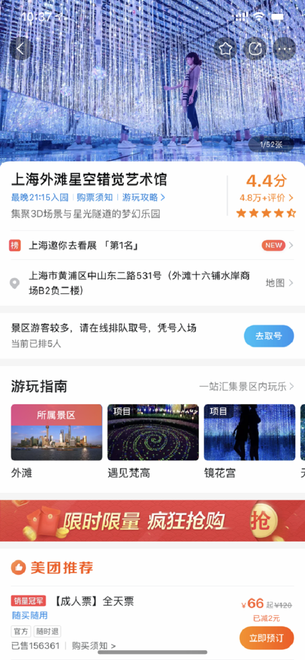 除“美团云排队”外,美团门票推出的智慧景区另一项功能“游玩指南”也在2018年一并上线。作为景区内项目排队的入口,游玩指南内含景区内所有热门游玩项目的介绍与推荐,并显示网友评价供游客参考。