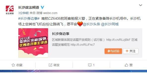 南航航班客舱报火警 正紧急备降长沙机场