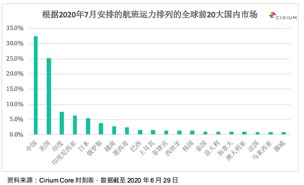 根据2020年7月的航班时刻表,全球前20的国内市场航班总数超过130万架次,与2019年相比下降了三分之一(32%)。
