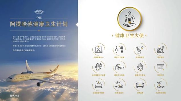 阿提哈德健康卫生计划在每个客户服务点贯彻最高清洁和卫生标准,例如在每次飞行后对飞机进行深度清洁和消毒、为每位旅客提供免费防疫包等各种措施。