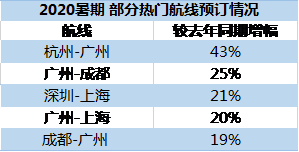 去哪儿数据显示,今年暑期多条热门航线预订量已经超过去年,其中杭州-广州暑期预订人数较去年同期增长43%、广州-成都暑期预订同比增长25%。