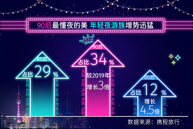 年轻夜游族的增势非常迅猛,从携程今年上半年的夜间票量订单与2019年上半年比较来看,90后夜游族增长近3倍,00后增长4.5倍。
