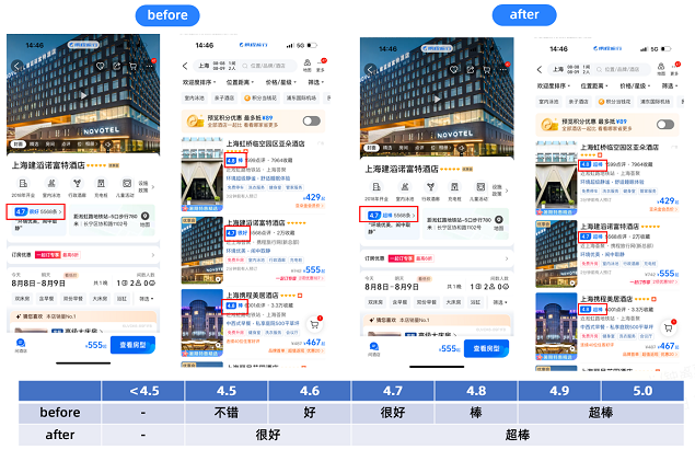 大于等于4.7分的酒店描述统一为“超棒”,强化正向感知