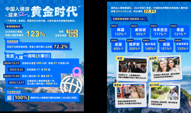 12月31日,携程发布《2025中国入境游年度报告》(以下简称“报告”),数据显示,2025年前三季度入境游预订已经实现了100%的增长,来自免签国家的订单增幅平均高达153%。这一系列数据不仅标志着行业全面复苏,更显示出中国正加速向“十五五”规划建议中提出的“旅游强国”目标迈进。...